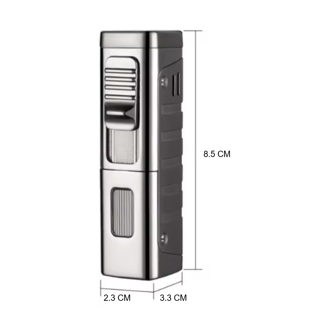 En la parte inferior del encendedor está equipada con un punzón, un orificio de carga de aire y una válvula de ajuste de llama, que es conveniente para llenar y ajustar el tamaño de la llama a voluntad.